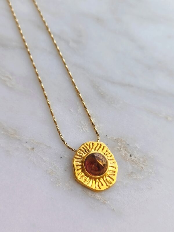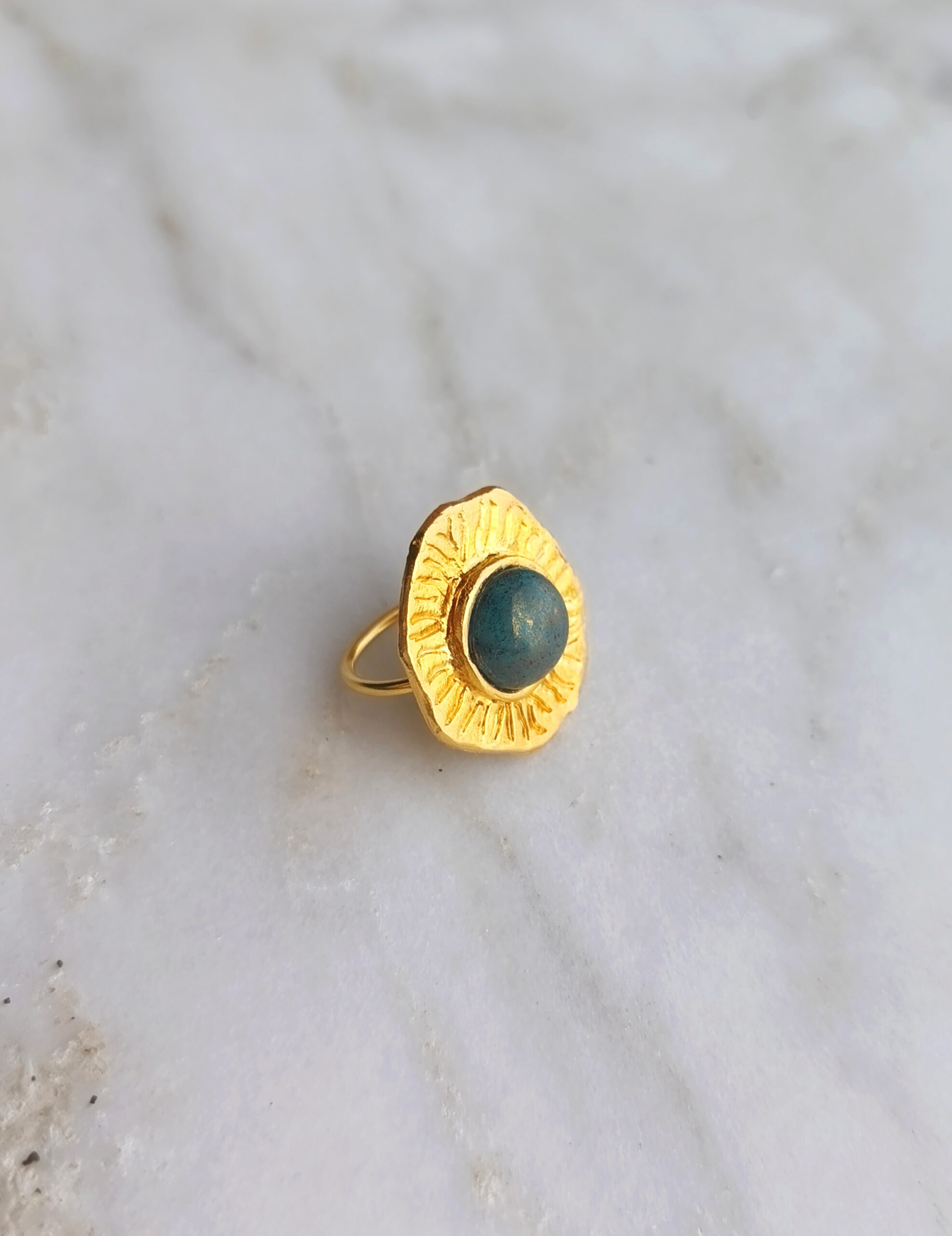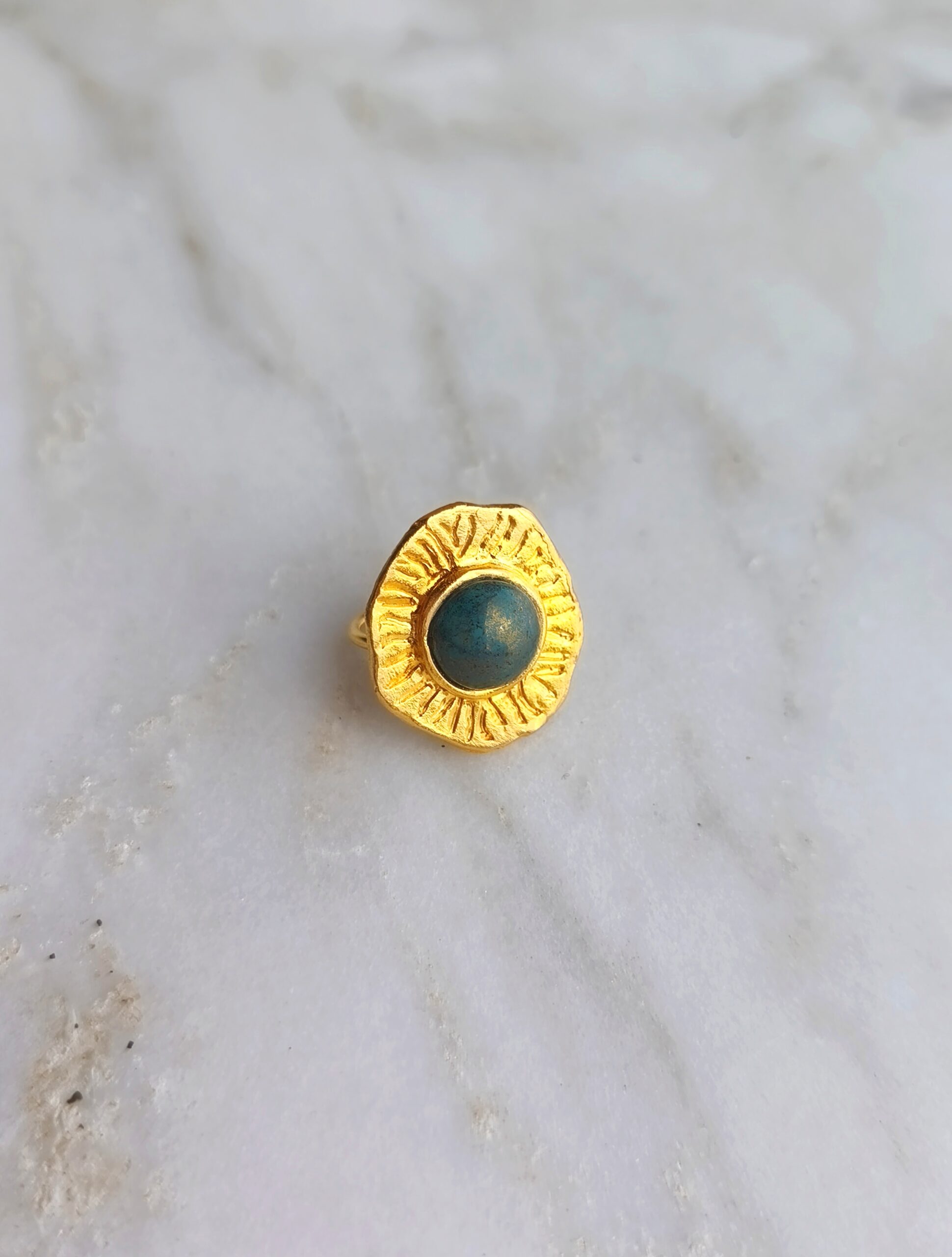 Ancien ring belongs to “C’est la vie” collection. The design is made of 24k goldplated bronze with semi-precious stone. It is an adjustable open ring.