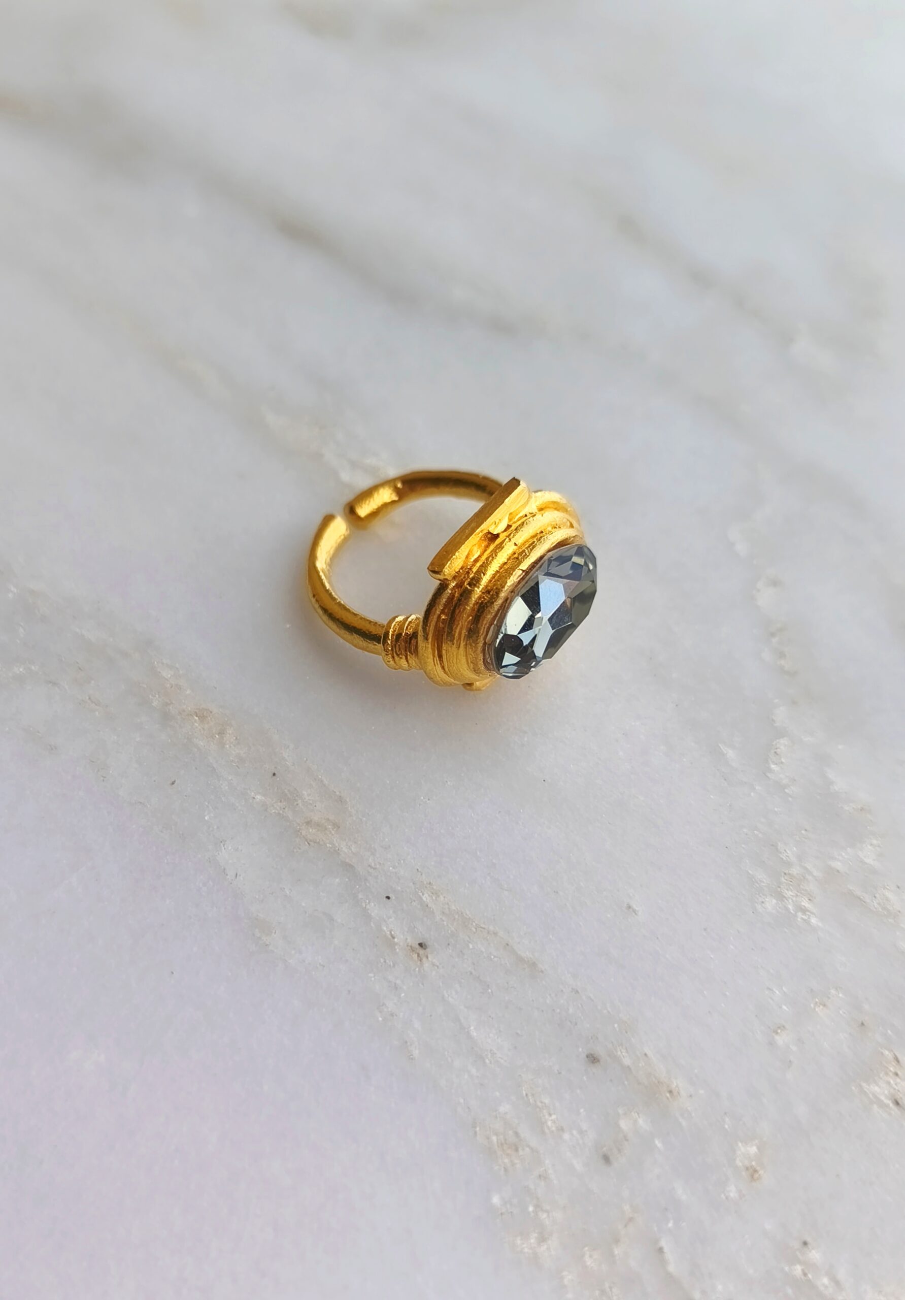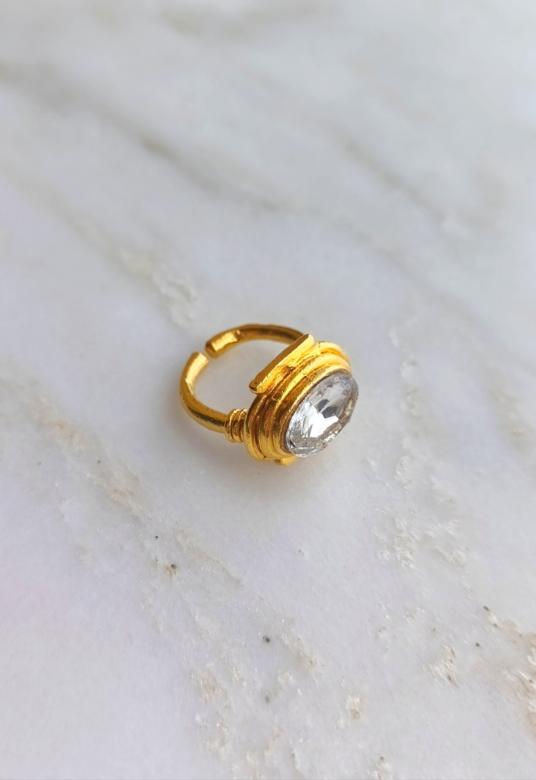 Classique ring belongs to “C’est la vie” collection. The design is made of 24k goldplated bronze with swarovski stone. It is an adjustable open ring.