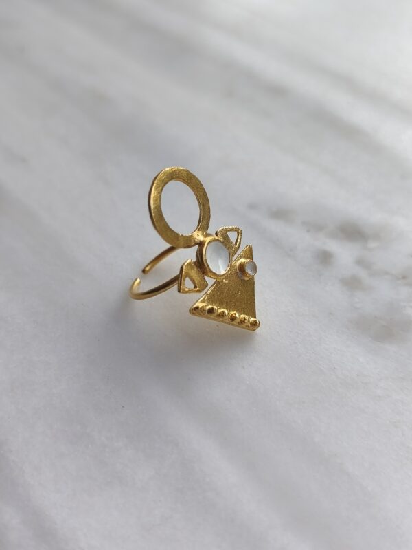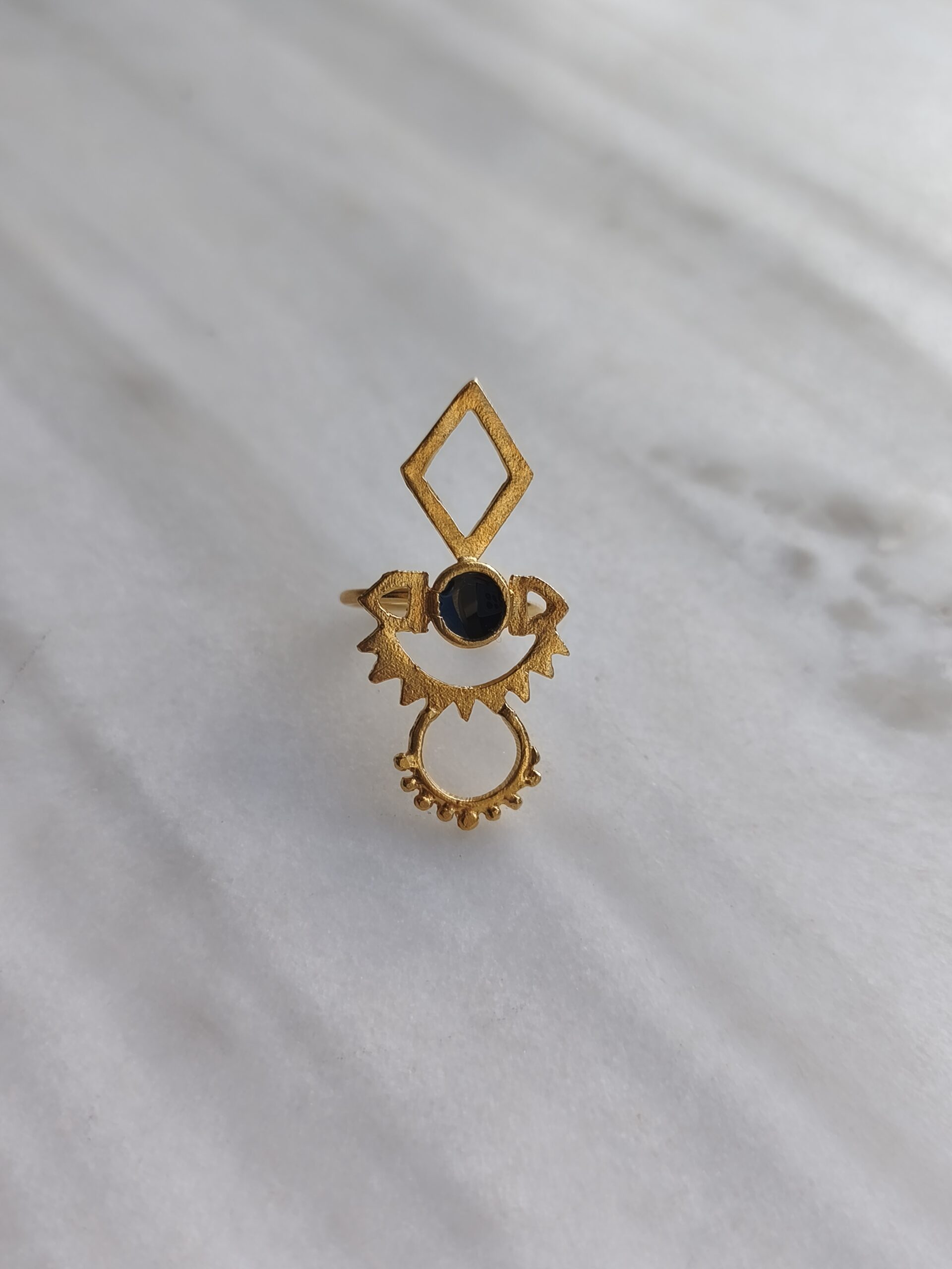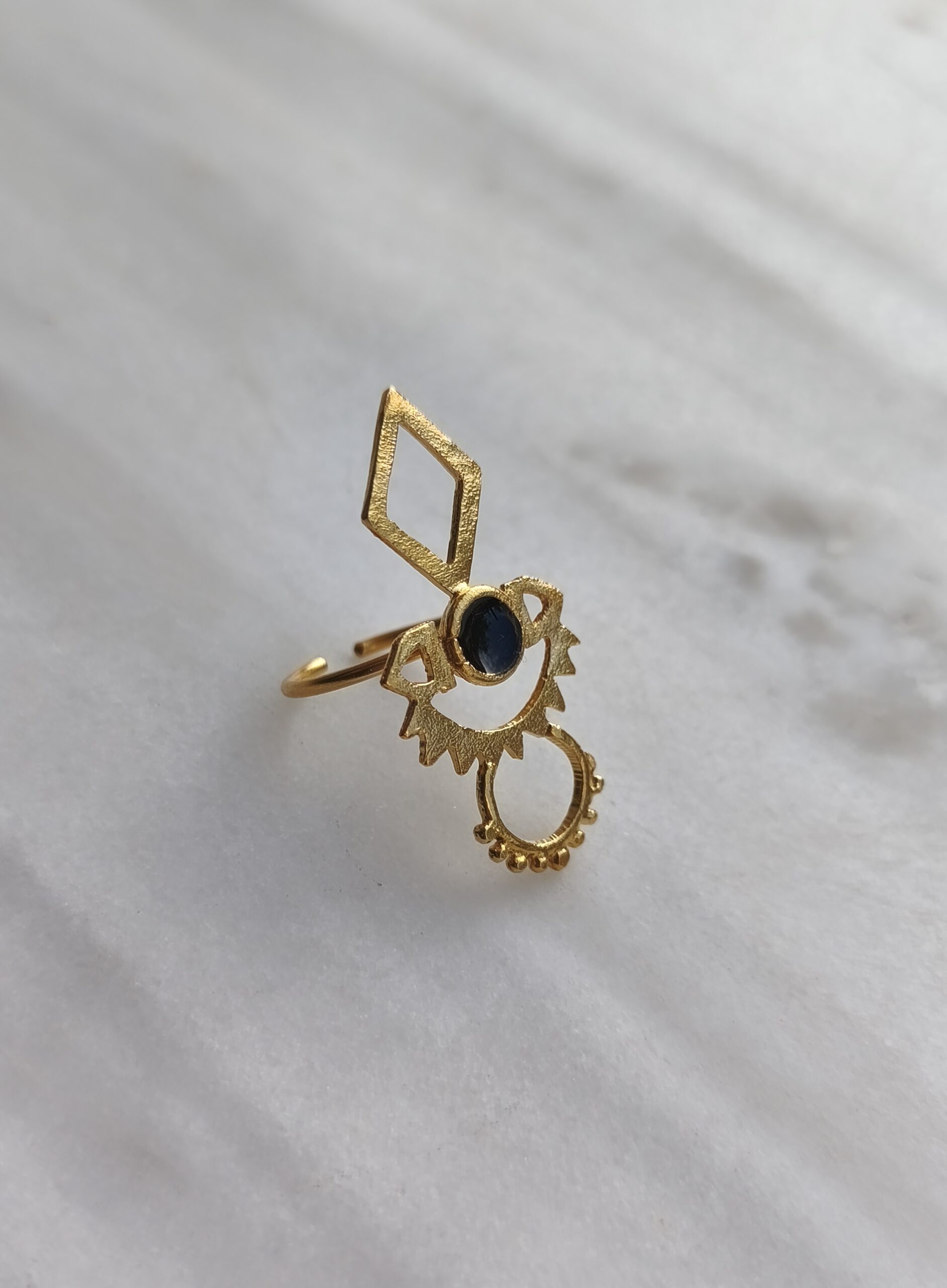The product is made of 24k goldplated bronze with enamel. It is an adjustable open ring.