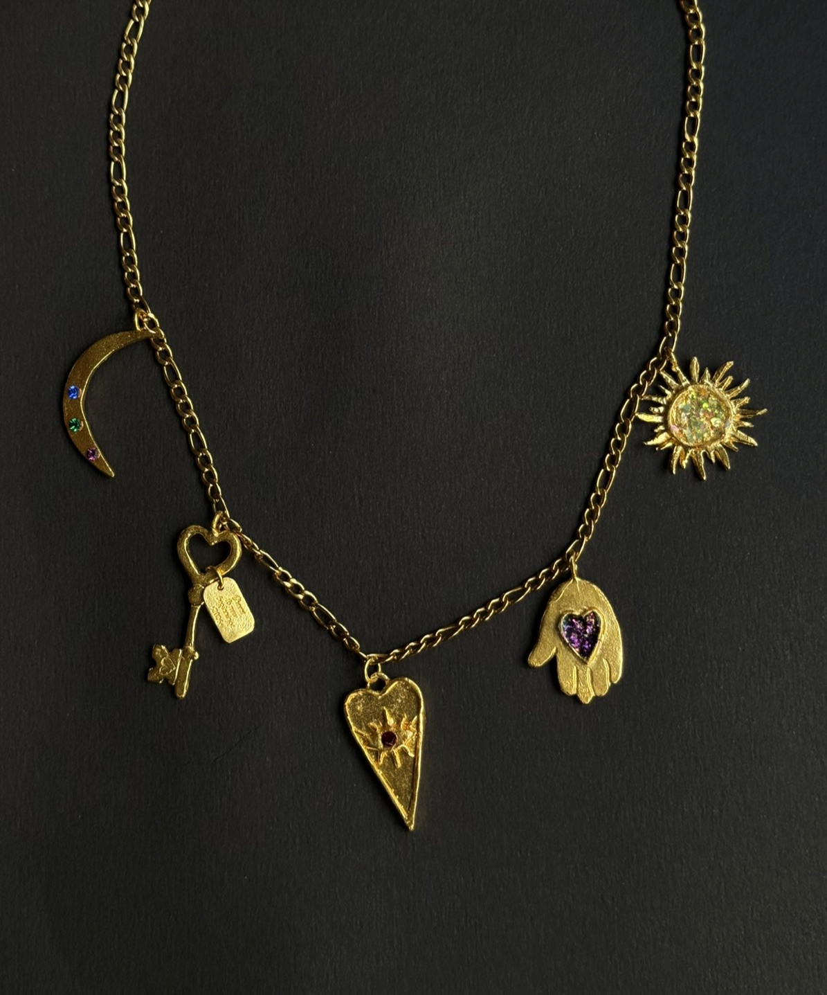 All of them are crafted from gold-plated bronze with Swarovski crystals and gold dust. The chain is made of stainless steel and measures 45 cm in length.