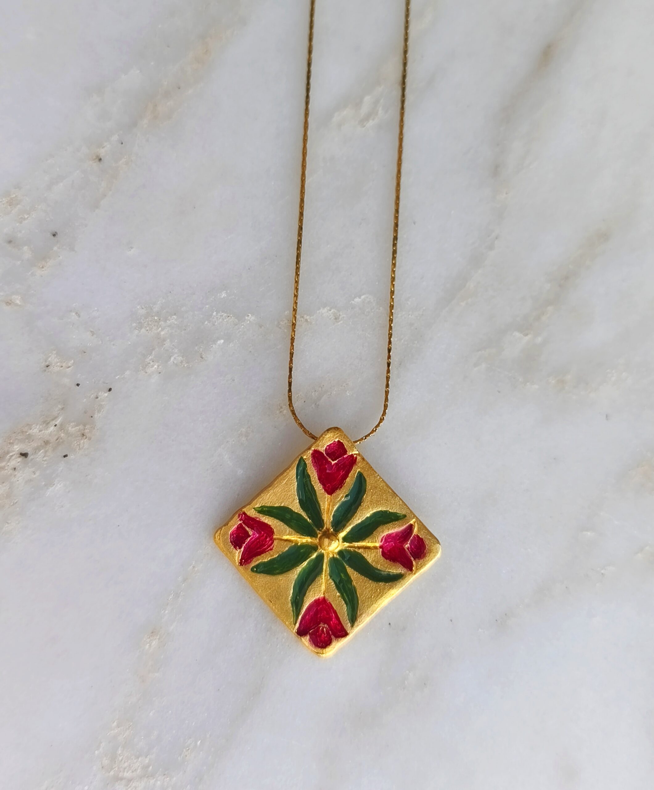 Motif necklace belongs to “C’est la vie” collection. The design is made of 24k goldplated bronze with enamel. The chain is made of steel and the length is 45cm.