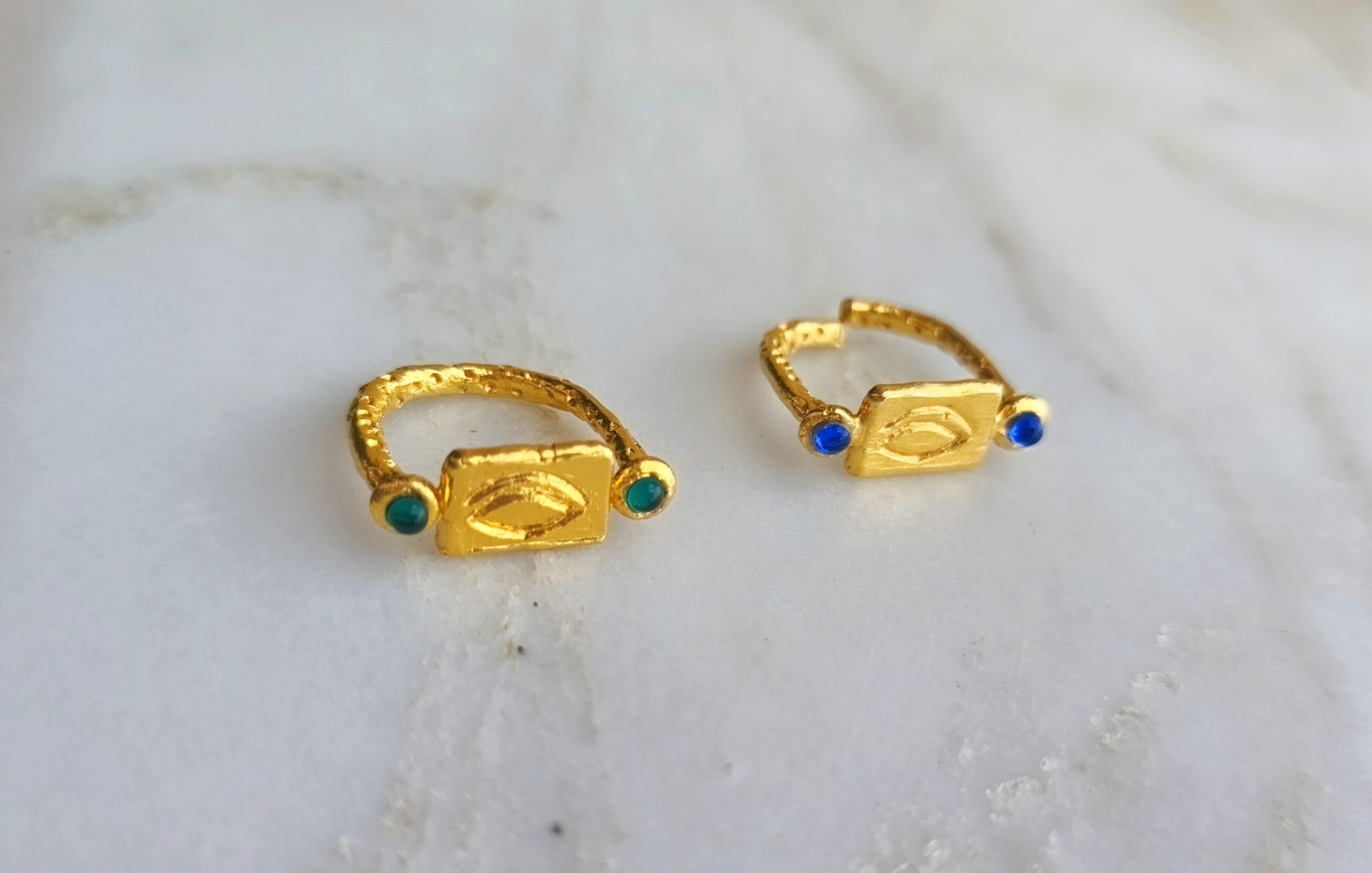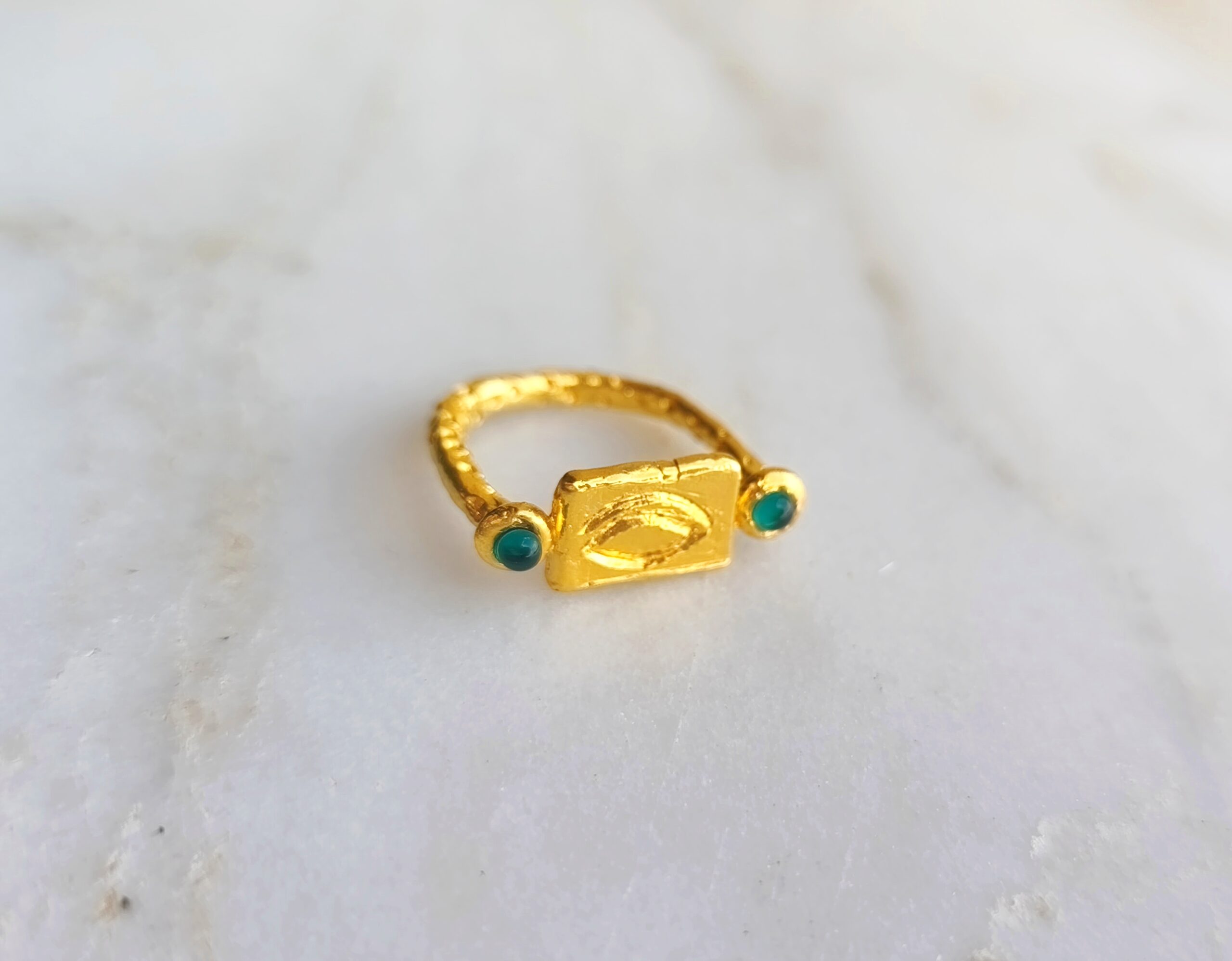 Petit oeil ring belongs to “C’est la vie” collection. The design is made of 24k goldplated bronze with semi-precious stones. It is an adjustable open ring.
