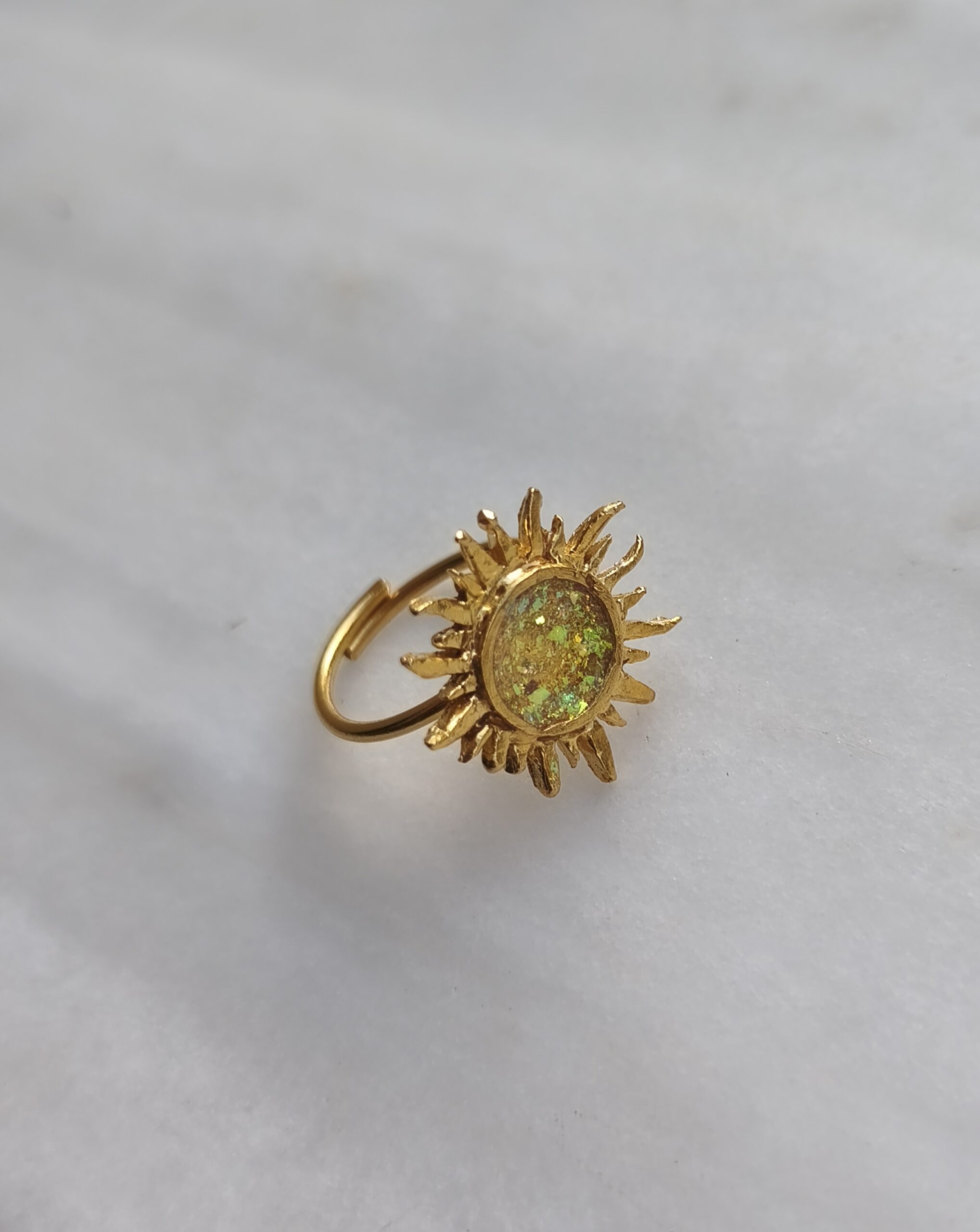 The product is made of 24k goldplated/silverplated bronze with gold dust. The size of the product is 2,3cm and it is an adjustable open ring.