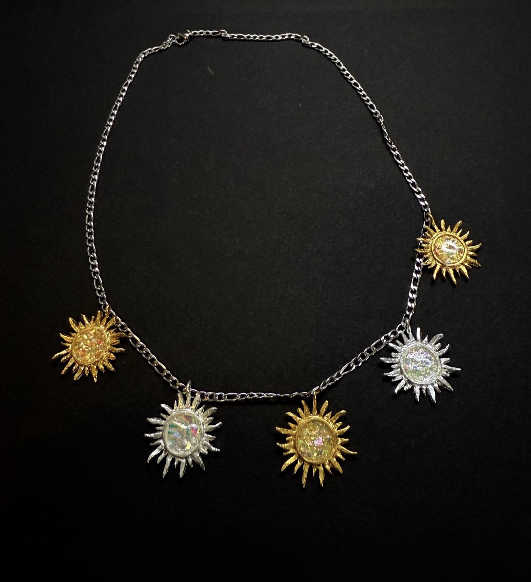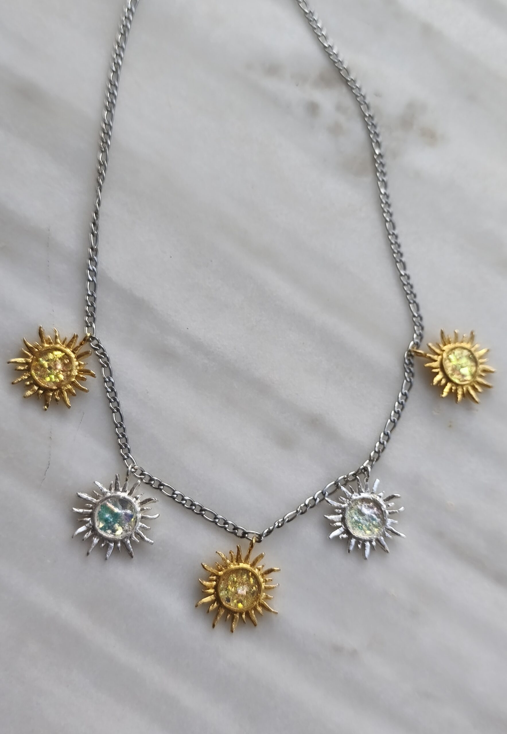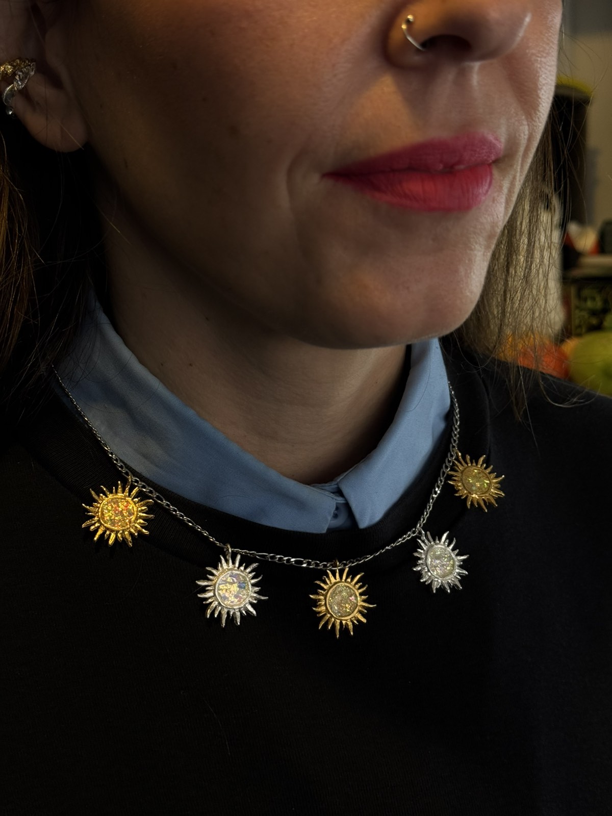 The product is made of 24k goldplated/silverplated bronze with gold dust. The length of the product is 2,3cm. The chain is made of steel and has length 0,45cm.